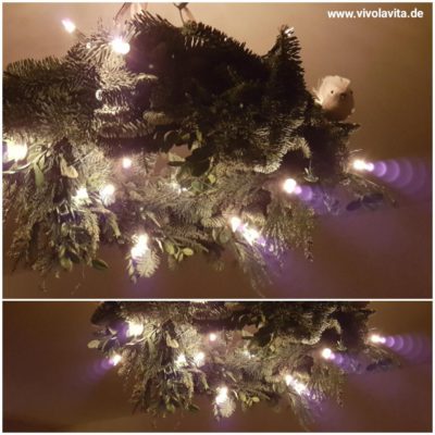Bei der Aufhängung habe ich mich auch für eine ganz schlichte Dekoration entschieden. Den gebundenen Kranz mit verschiedensten Nadelgrün habe ich mit nur einer Lichterkette und mit 4 weissen sehr schlichten Vögeln versehen und an einen Hacken in der Decke gehangen.